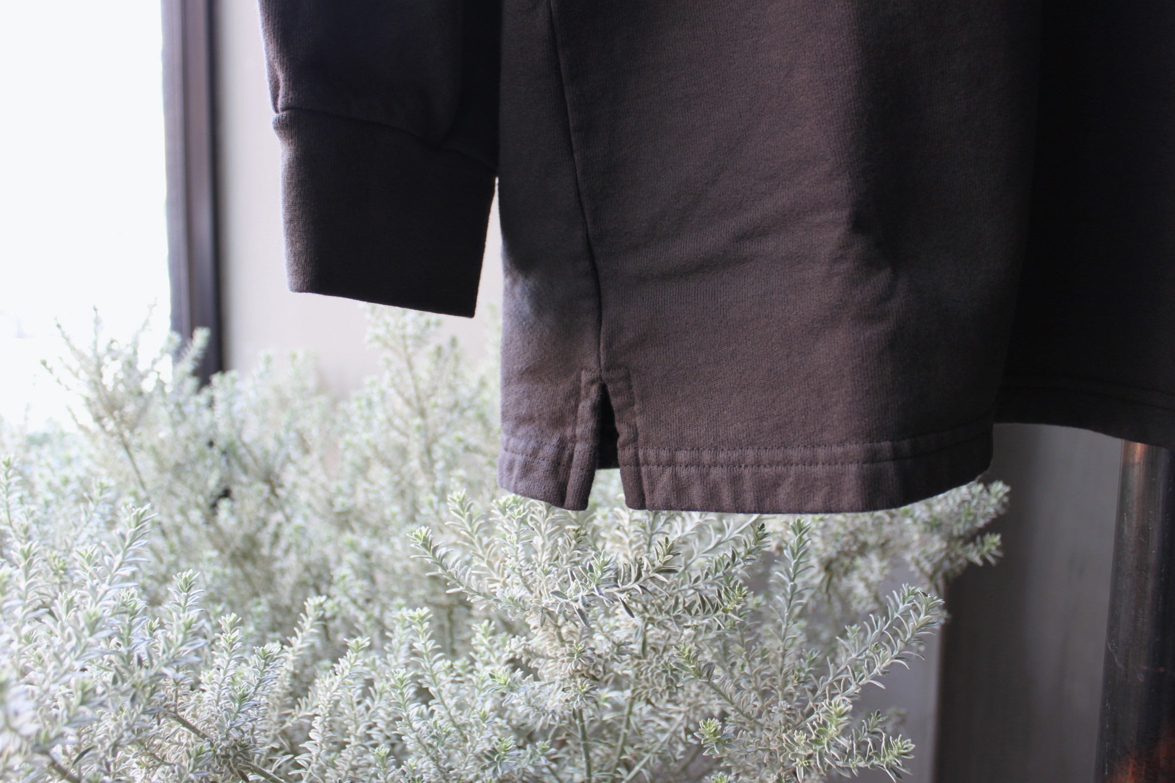 柔らかな肌触りの良いアメリカンコットンを使用したCrew Neck Sweat Shirt。薄すぎず、厚すぎず、柔らかくふんわりとした丁度良い厚みの10ozコットンフリース。目の詰まったスウェット生地と言うよりもカットソーよりも厚みがある程度の良い素材です。まだロンTやシャツだけではどうかな、なんて時に最適ですね。私も昨日インナーにTシャツを着て合わせていましたが日中は丁度心地良く着る事が出来ました。セットインスリーブの袖付けも良くストレスを感じない着易いさも気に入っています。重ね着にも最適なやや詰まり気味のネックライン、両袖はリブ仕様。裾はリブでは無く軽い雰囲気を出してくれるスリットになっており、カリフォルニアらしいデザインも特徴です。身幅は適度なゆとりを持たせ、着丈はすっきりとしたシルエット。肩幅が広めに取られている分、袖丈を短めにしたとてもバランスの良いサイズ感です。真っ黒では無くウォッシュドブラックの様なフェード感あるブラックも良い風合いですね。チノや軍パン、薄めのデニムとも良いかと思います。Online Shopにも掲載しましたのでお好きな方は是非。