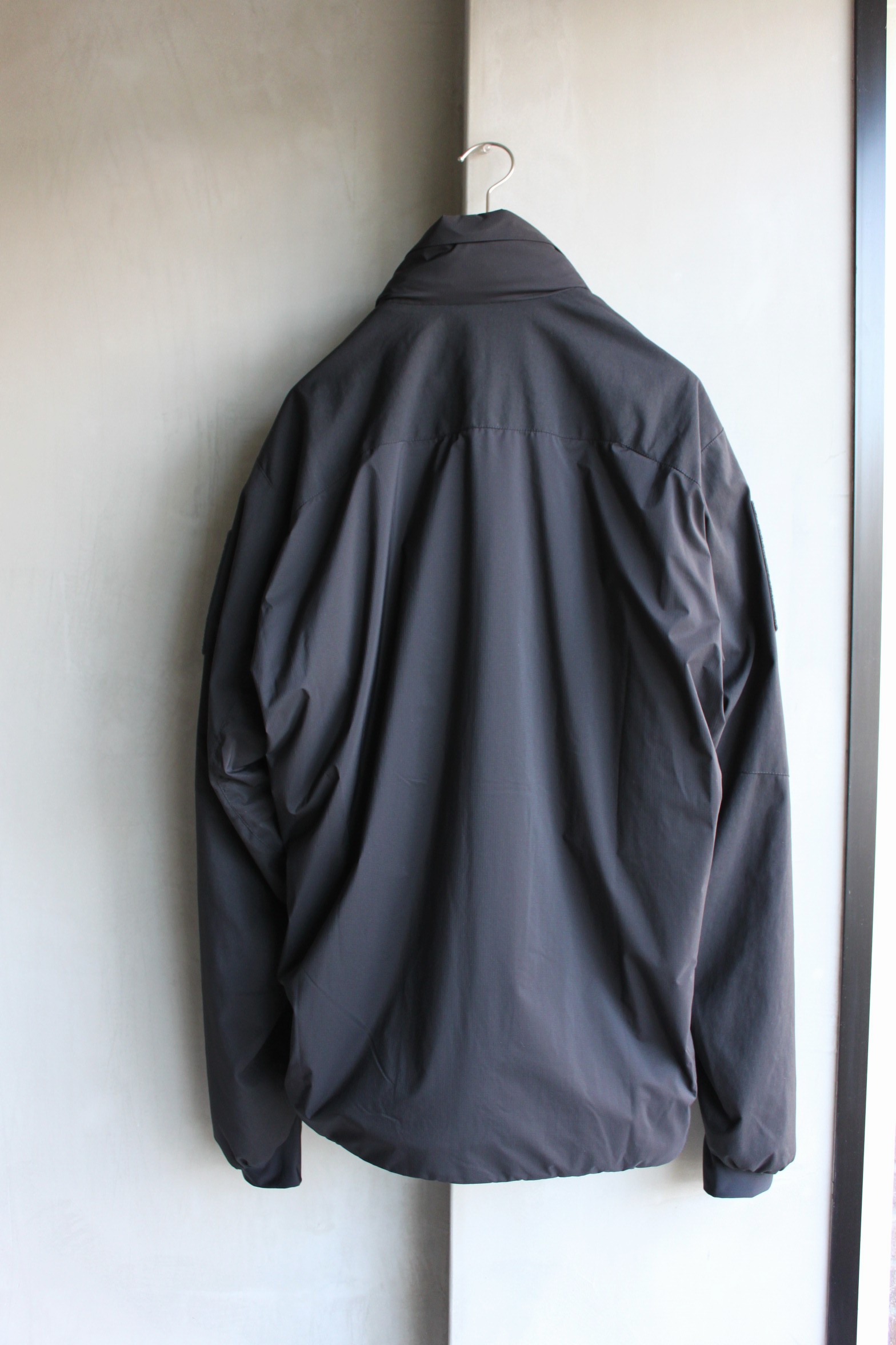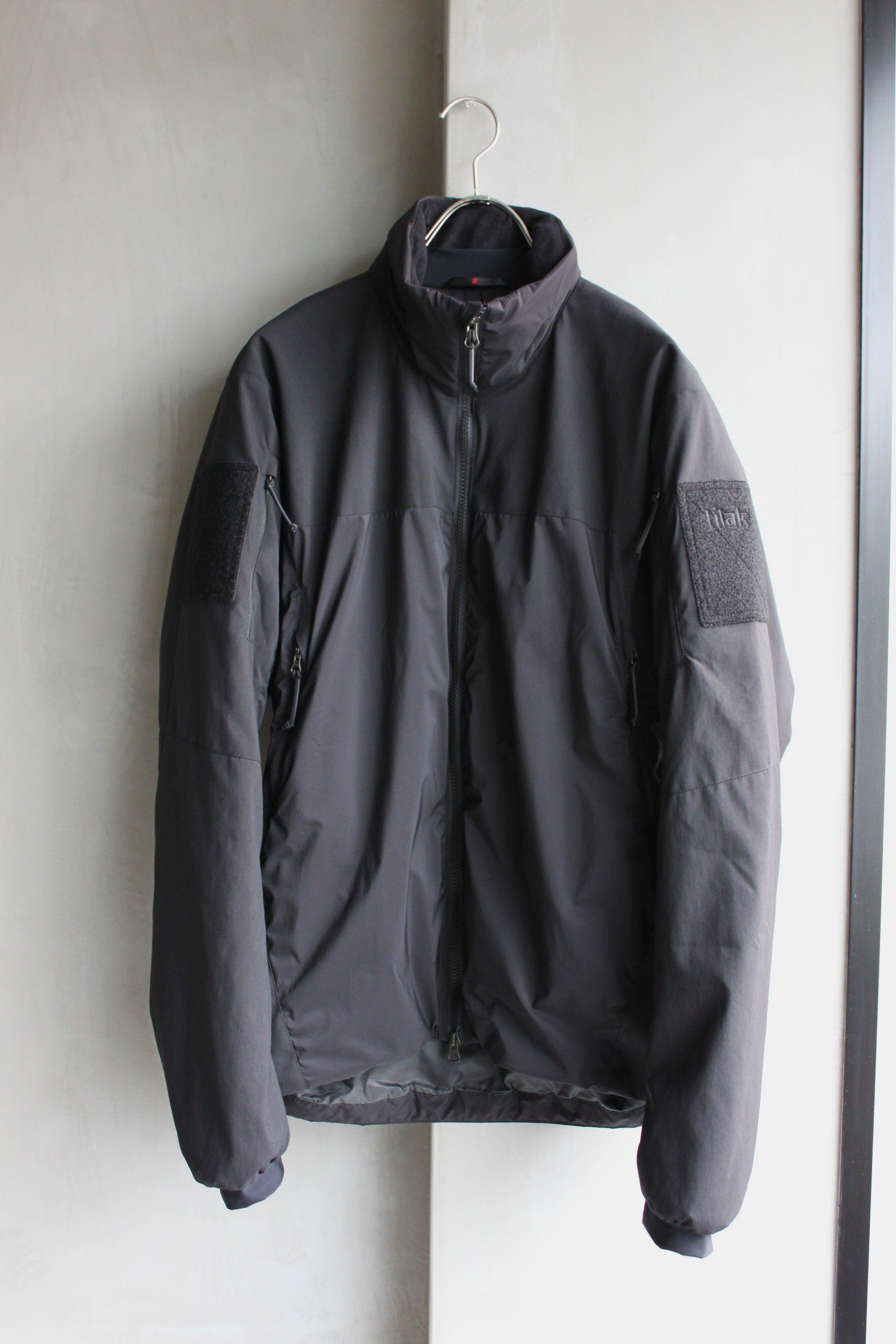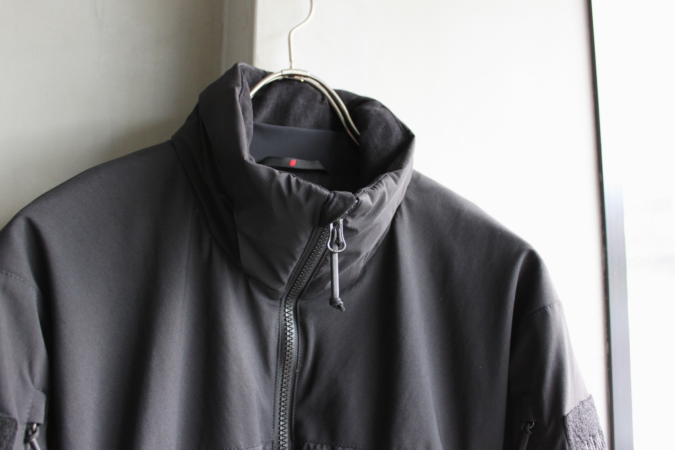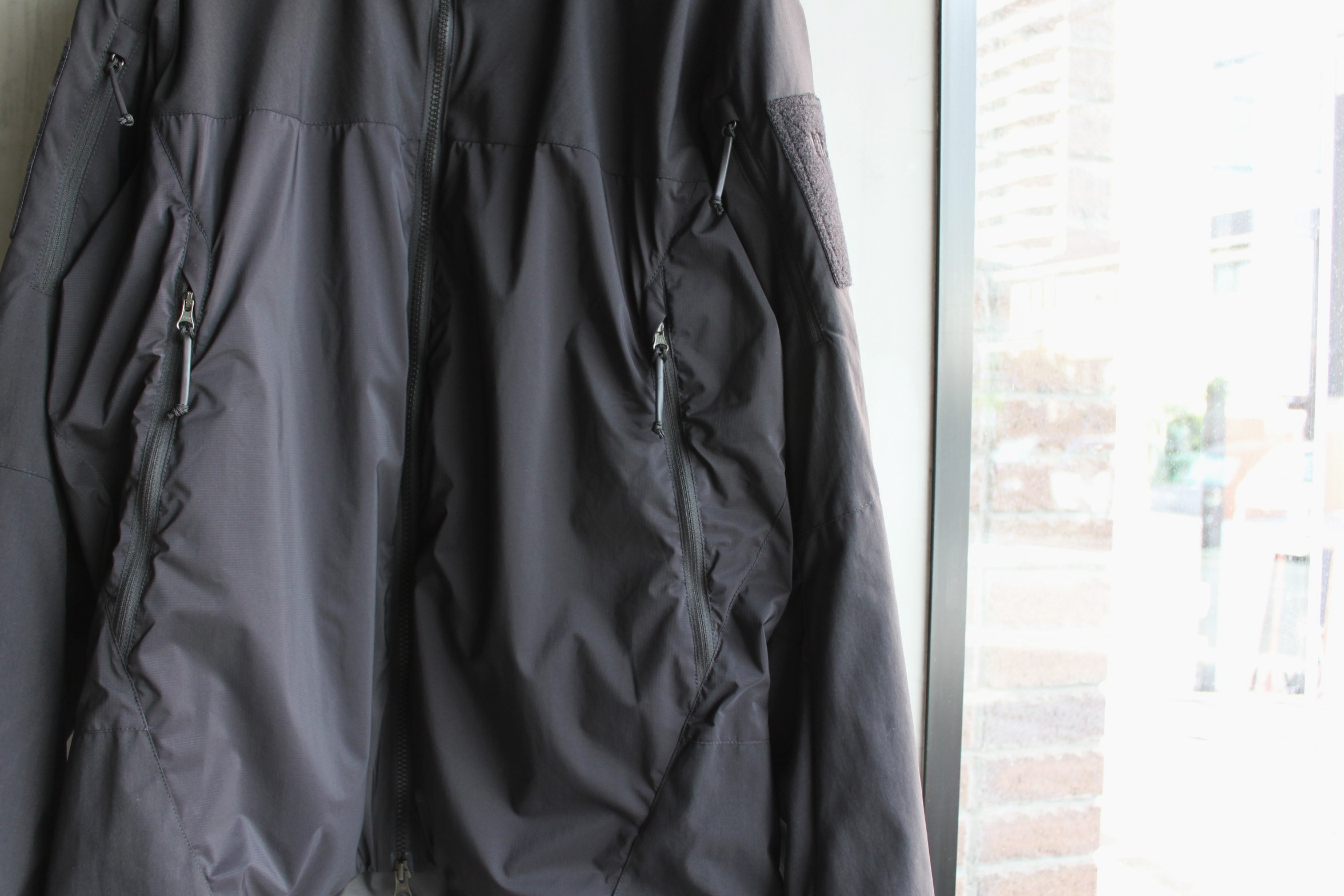 写真では伝わり難く申し訳無いのですが、シェルのPertex Quantum Airのカラーがブラックにアップデートされオールブラックにまとまりより完成されたデザインに仕上がりました。気が付かれた方は立派なTilak通ですね…。時代に合わせアップデートを繰り返しほぼ完成形となったのでは無いでしょうか。このVerso Jacketはご愛用者も多く、ご購入下さった方の満足度が非常に高いモデルの一つです。薄手で軽量のPertex Quantum Airをシェルに採用し、防風性と撥水防雨性能に長け、中綿には濡れに強い化繊綿Polartec Alphaを用いた薄手のインサレーションジャケットです。インラインとは異なり、肩から腕にかけては強度の高いナイロンファブリックで補強し、腕のポケットとベルクロループ面が加わった仕様です。特殊な環境下で着用される事から通常採用されるブランドロゴ刺繍では無く、目立たないボディと同色の刺繍や両腕に取り付け可能な3種類のワッペンが付属した軍仕様のミリタリーライン。通気性のあるPolartec Alphaは活動時の断熱素材に位置付けられた保温性と通気性を兼ね備えています。フロントはダブルジップ、両サイドポケットとインナーチェストポケット、両裾にアジャスターを装備。ジッパーの番手を上げた大きめのコイルジッパーとナイロンコードを熱収縮チューブでまとめたジッパープル等、厳しい仕様環境でもスムーズで確実な動作が出来る様になっています。スリーブエンド、ネック周りは外気の侵入を防ぎロフト内の温めた空気を逃がさないストレッチファブリックを採用しています。高めのスタンドカラーにフードを収納しています。ボリュームを抑えた立体感あるすっきりとしたシルエット。ダウンや厚手の中綿には保温力はどうしても劣りますが車での移動が多い方や幅広いシーズンのアウターとして着たい方には十分なスペックですし、実際に冬場のアウターとしてもご愛用中の方は多くいらっしゃいます。残りM、Lサイズのご用意ございますのでお持ちで無い方は是非お試し下さいませ。