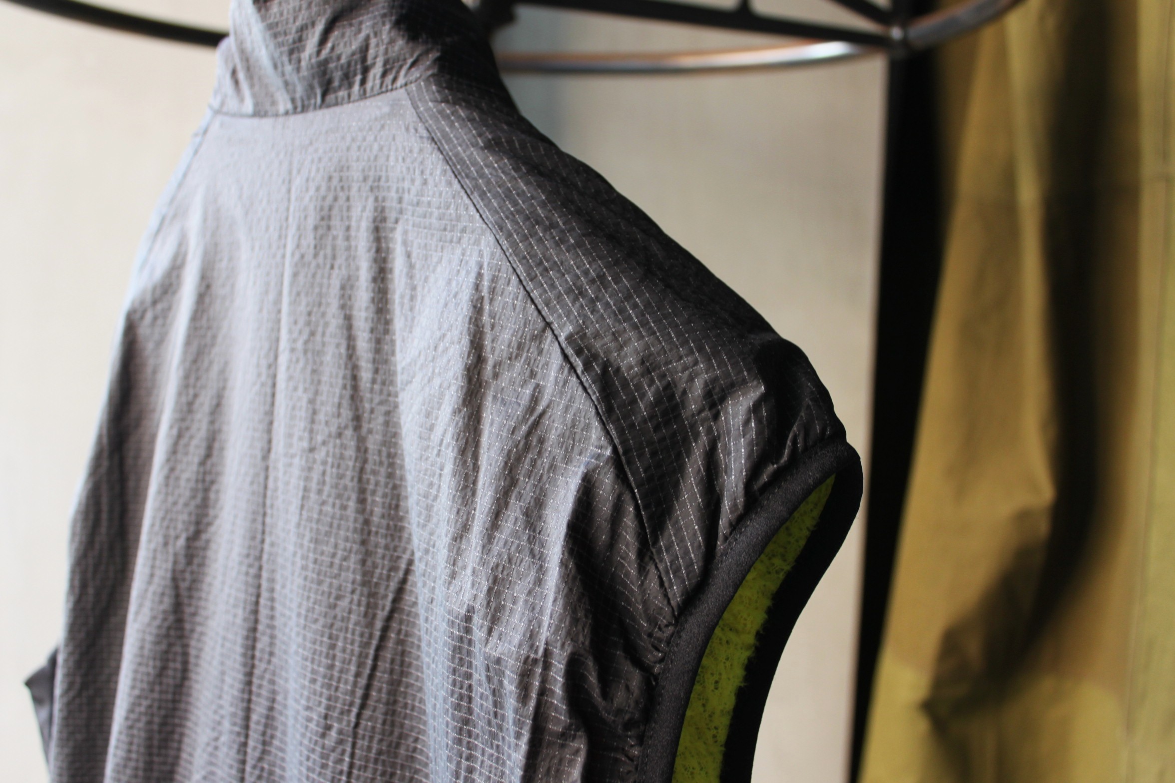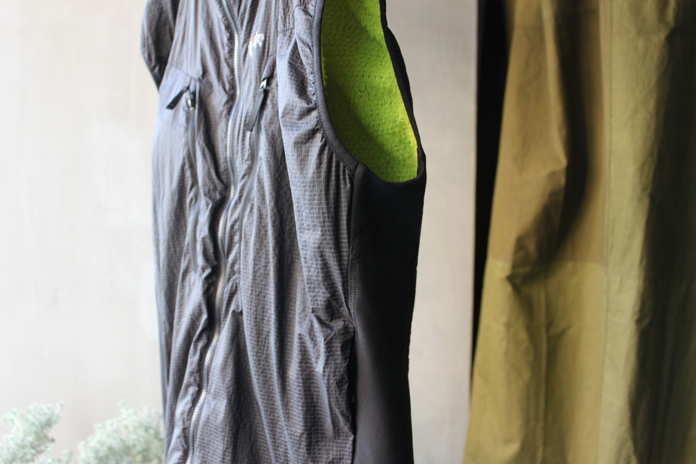 毎シーズン欠かさずチェックはしていましたが今シーズンは素材やパターンもアップデートされこれはOlimpicoに必要だなとオーダーした次第です。皆様が狙っている新型のAltair MIG Jacketの陰に隠れてしまいましたが実はこのSpike Vestもかなり動きが良くてMサイズは完売、残りSサイズが1枚、Lサイズが3枚とご好評頂いております。メインファブリックは最新のリップストップ素材、90年代のPatagoniaの様な格子がはっきりとしたグリッドリップストップを用い内側には発色の良い蛍光イエローのPolartec Alphaを剥き出しにした仕様です。あえてインサレーションにする事無く通気性と保温性のバランスを保ち体温を逃がしすぎず蒸れを防ぐ役割を兼ね備えています。ご試着頂くと判るのですが独自のカッティングパターンで肩周りが立つこと無くとても良い収まりです。フロントポケット、サイドポケットもしっかりと便利な位置にあり、フロントはダブルジップです。非常にバランス感の良いベストですので是非お試し下さいませ…と書いている途中でSサイズも完売となりました、ありがとうございます。お好きな方は是非。